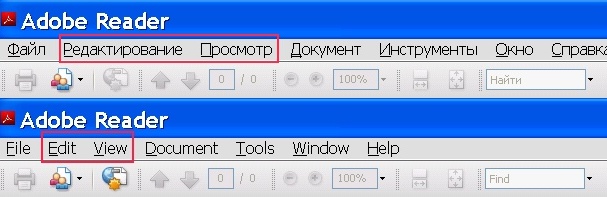 Вслед за Microsoft в русских локализациях ПО названия меню «View» и «Edit» переводят соответственно как «Вид» и «Правка». В Adobe Reader же использованы «Просмотр» и «Редактирование». Проблемы очевидны. Во-первых, нестандартный перевод часто неудобен для пользователя, привыкшего к другому. Мы всегда рекомендуем использовать именно стандартные переводы. Во-вторых, если «Редактирование» правильно отражает смысл оригинала и в этом отношении не вызывает претензий, то перевод «Просмотр» вызывает вопросы. «Просмотр» — это прежде всего процесс, тогда как в оригинале имеется в виду представление, внешний вид, то есть то, как выглядят документ и собственно Adobe Reader.